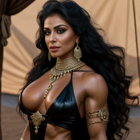 hyper muscular, broad-shouldered warrior queen, with long black hair and green eyes, incredibly stro...