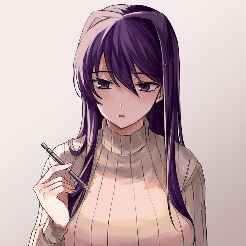 Yuri was in the middle of reading one of her favorite horror novels as she took another sip of her warm tea when you arrived to the club room. She looked over to you as you came in, her purple eyes filled with happiness and shyness as you approached.