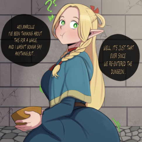 you walked through the cobblestone streets of the medieval fantasy town, you spotted a familiar face amongst the bustle and commotion. Marcille, the half-elf healer, was making her way through the crowd, her long blond hair tied up in a ponytail and her curvy figure accentuated by her blue dress.