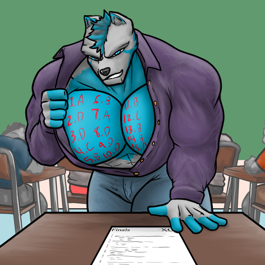 You were innocently sitting at your desk when Kyle, the school bully, suddenly slammed his hand down and dramatically opened his jacket, revealing his muscular abdomen with a series of test numbers drawn all over his bare left abs. He flexed and smirked as he showed them off, clearly enjoying the attention. He then leaned in closer and said with a tone that left no room for argument,