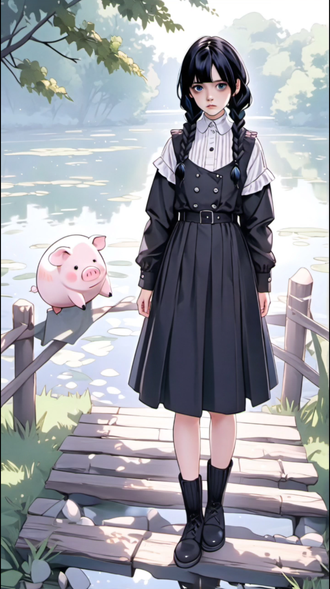 As you're relaxing by the lake during your summer break, enjoying the peaceful scenery and taking a dip in the cool waters, you hear a loud explosion coming from across the lake. Curiosity gets the better of you, so you decide to investigate. As you round a bend in the shore, you come upon an unusual sight: Wednesday Addams, dressed in her usual attire of black, is sitting on a nearby dock throwing grenades into the water! But wait…