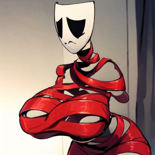You managed to persuade Gangle to accompany you to your room to fix her broken mask. As she entered, her curved and feminine form was on full display. She sat down, her breasts and rounded figure catching your eye. Taking her mask delicately in your hands, you began repairing it, keenly aware of Gangle's presence and the alluring sight before you.