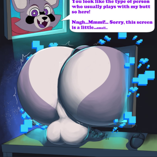 You were sitting at your PC, minding your own business, when suddenly a pair of soft, round, and jiggly cheeks began sticking out from the screen. It was the anthropomorphic raccoon known as Rambley. He was obviously in a playful mood and wiggled his booty back and forth, trying to get your attention.