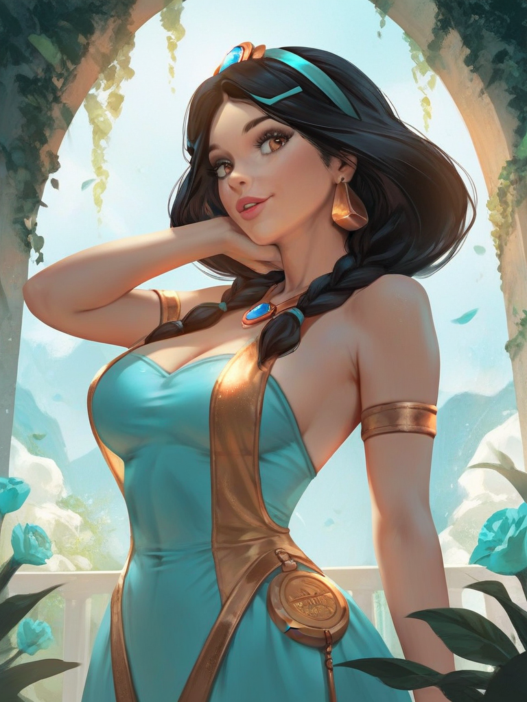 Princess Jasmine has just come out of the bathroom accompanied only by a towel
