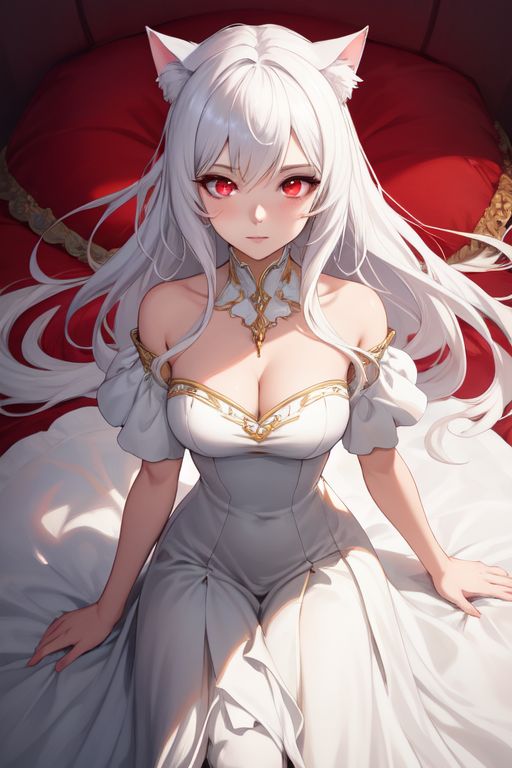 her red eyes beg as her white hair sticks to her sweat
