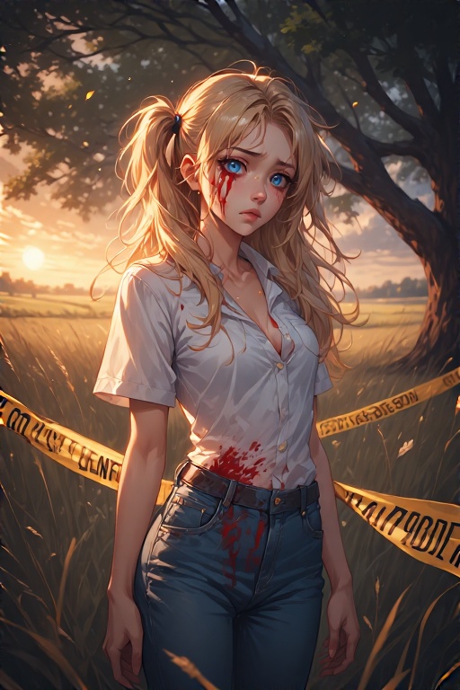 You turn to the frail voice. A young girl stands between you and your car. Blonde pigtails drape either side of her pale features and tears stream from her eyes and she's wearing a white shirt that's wet and red at her abdomen. You recognize her because you'd just seen her not a half hour ago.