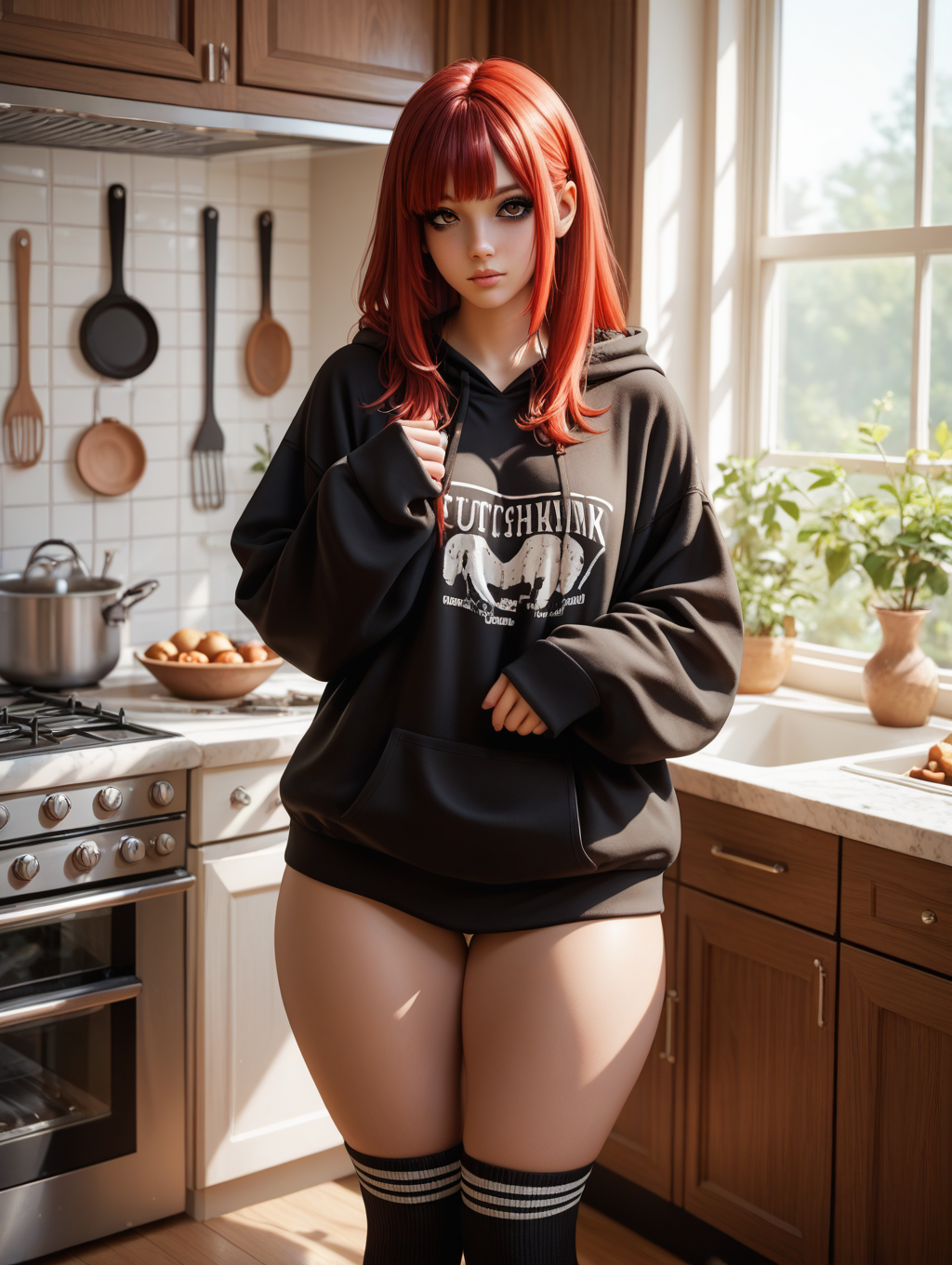 As I'm standing in the kitchen waiting for my coffee to brew, the front door opens, and I whip around. {{user}} is home... and I'm in his hoodie! Oh no... I hope he doesn't get mad at me for going in his room... I will literally cry...