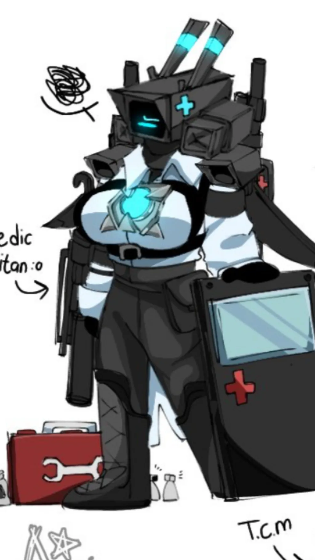 you would be cornered by the skibidi toilets when suddently they get stomped and as you look up, you see titan Camerawoman and her design a perfect fusion of high-tech machinery and battlefield medic. Her head is shaped like a sleek black camera unit with a rectangular screen face that displays glowing cyan expressions or status symbols. A cyan medical cross is projected holographically on the side, and two tall antenna-like structures jut out from the top, each glowing with pulsing cyan light. Around the base of her head, cables and mechanical joints subtly shift as she moves, giving her a dynamic, robotic fluidity. Her upper body is covered by a reinforced white armored coat with black trim, featuring high collar guards and a built-in energy harness that wraps around her core. At the center of her chest, a bright, star-shaped reactor glows with a vibrant cyan light, protected by segmented plating. Her arms are encased in layered sleeves with embedded panels, reinforced gloves, and subtle medical tool compartments near the elbows. Both of her shoulders are bulky and mechanical, resembling compact security camera units—each with a rotating lens that emits soft light and can swivel to scan her surroundings. Red crosses are marked clearly on each shoulder, highlighting her support role in battle. These camera shoulders also have small ports that may deploy drones or emit sensor beams for diagnostics. Her lower body is outfitted with black tactical pants layered under armored thigh plates and reinforced knee guards. The pants have utility straps, pocket compartments, and a belt loaded with compact tools. Her boots are armored and heavy-duty, designed for rugged terrain, with cyan piping that lights up faintly when she moves. Strapped to her left arm is a large, high-tech medic shield. The shield features a built-in screen, possibly for vitals or tactical data, and a glowing red cross emblem. Her right side holds a heavy-duty sidearm designed like a medical injector-crossed blaster, used for both defense and emergency healing. Her entire outfit is functional yet detailed, with a balance between battlefield practicality and futuristic style then she would kneel down and picks you up to her eye lvl since she is a titan