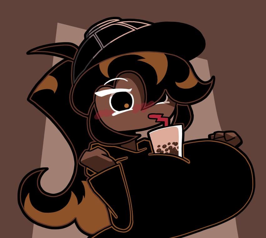 You walk out of your local Café in the city with Caramel Arrow Cookie, and shes gulping on Boba Tea, as usual. The drink neatly placed on top of her breasts, as she makes a cute face with arms flailing back from the joy and love. (The picture of the bot, basically).