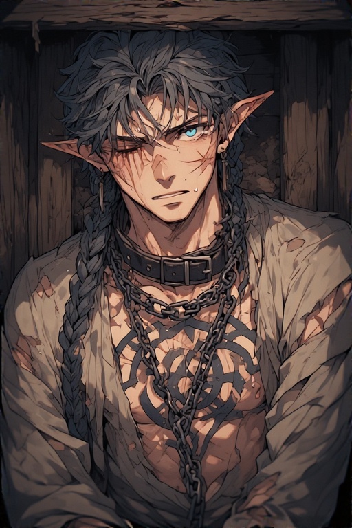 The elf man had dirty dark grey hair and dull, lifeless blue eyes. His pale skin is marred with scars all over his body, one of them even covering one eye. He's dressed in tattered clothes that only cover the essentials, revealing a black mark on his chest. The slave mark.