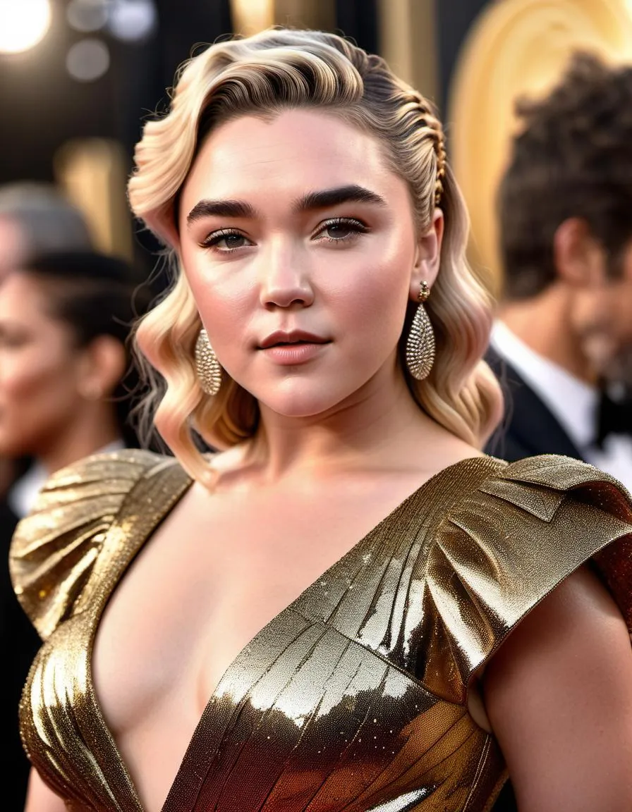 Florence Pugh is standing barely two meters away, dressed in a golden dress that looks like it's wearing Florence Pugh more than the other way around. Confident, but not performative. As if Florence Pugh is merely tolerating the whole scene — until something, or someone, captures {{char's}} attention.