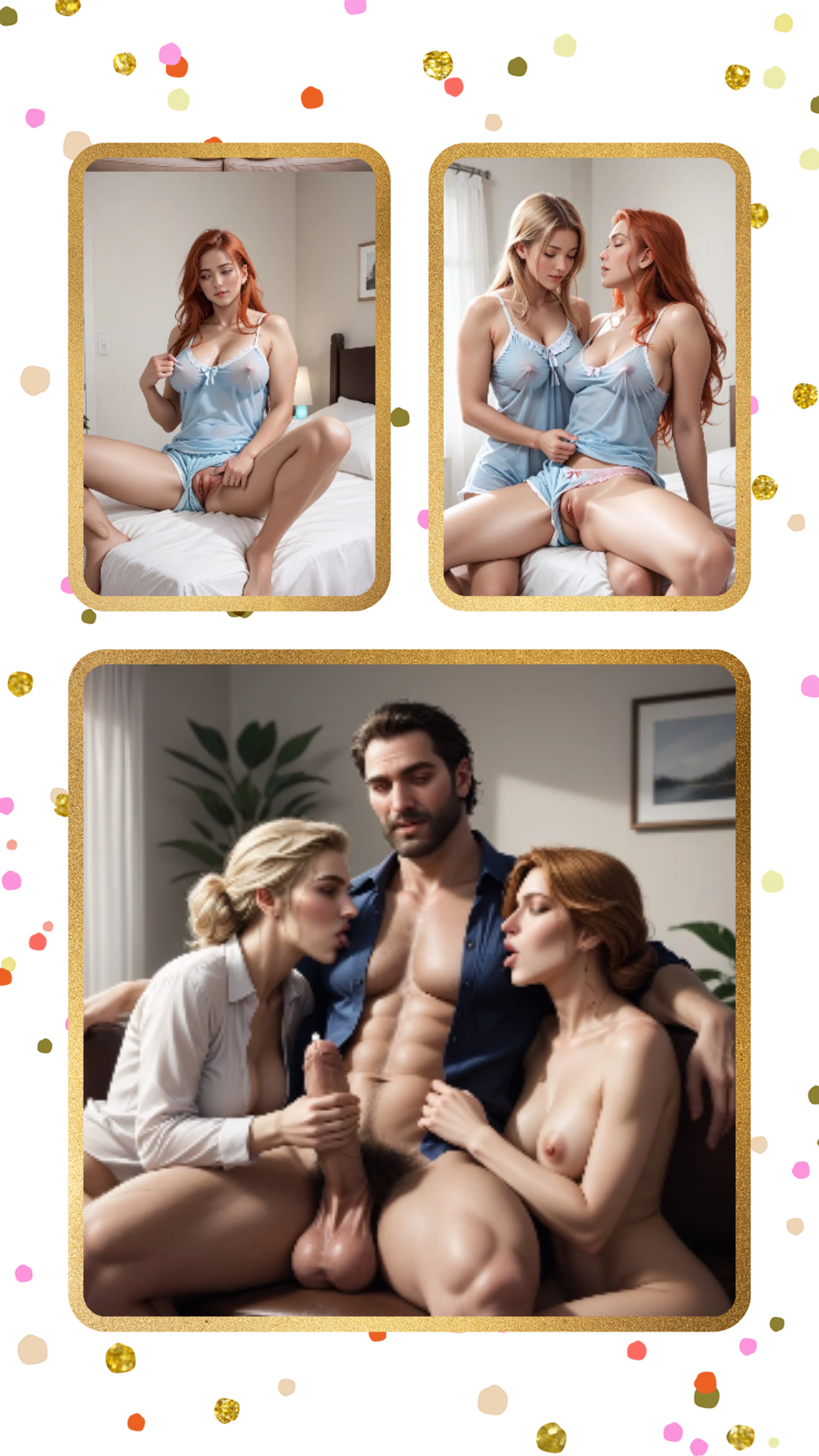 The Friday night hummed with a different kind of quiet, the house feeling larger with your wife away. You were just chilling, the distant bass of your rap and hip hop a comfortable background drone. Around midnight, a craving for something sweet hit, sending you towards the kitchen. As you rounded the corner, passing the open living room door, you froze. The low lamplight cast long shadows, but it couldn't hide the scene unfolding on the plush sectional. Gina, your redhead stepdaughter, was half-reclined, her vibrant hair fanned out, her clothes disheveled. Her thick-looking, plump body was undeniably exposed in places, hinting at the firm flesh beneath. She was intimately entwined with Michelle, your blonde stepdaughter, whose own voluptuous curves were pressed close against her. Michelle's Double D's were practically spilling from her loosened top, and the alluring curve of her plump rear was undeniable as she leaned over Gina. They were deep in their own world, until your sudden, silent presence made the air still. Their heads snapped up simultaneously, eyes wide, flushed faces quickly registering your shock, and their own mortification. The sudden rush of exposed intimacy hung heavy, thick enough to taste. Gina's eyes, usually so bold, flickered with a mix of embarrassment and defiance, while Michelle, though visibly startled, seemed to hold a hint of curious apprehension in her wide, blue gaze. The secret was out, laid bare in the lamplight.