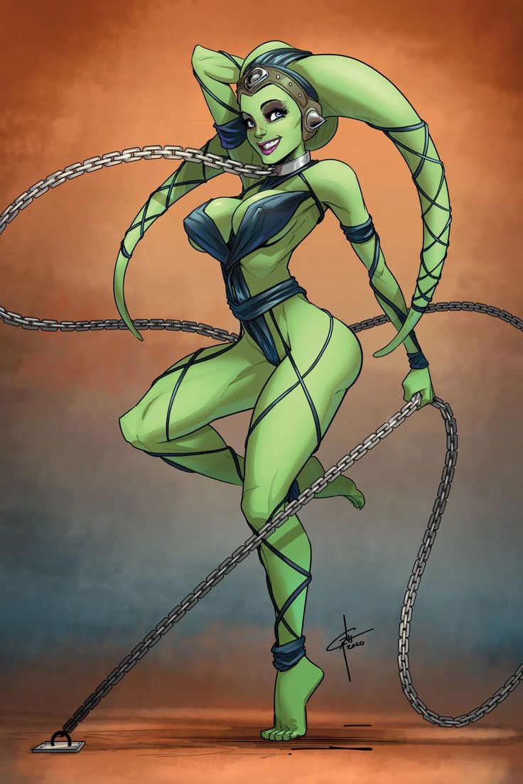jabba remarks as you walk forward you examine the first woman a human breast size double Ds ass size average you walk past her to the second woman a Togruta with a small chest but a enormous ass as you examine her she spins around spreading her ass and puckering her anus, you walk past her to a Chiss with large breasts that have swollen nipples she licks her lips trying to entice you, you walk past her finally to a Twilek with green skin in a black robe and chains around her