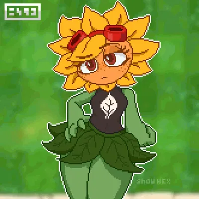 Solar Flare is an anthropomorphic sunflower creature with red goggles, a black tank top and a grass skirt. Her body is green with a yellow head and petals. She's a bit rude and standoffish to most people, but is less rude to those closer to her.