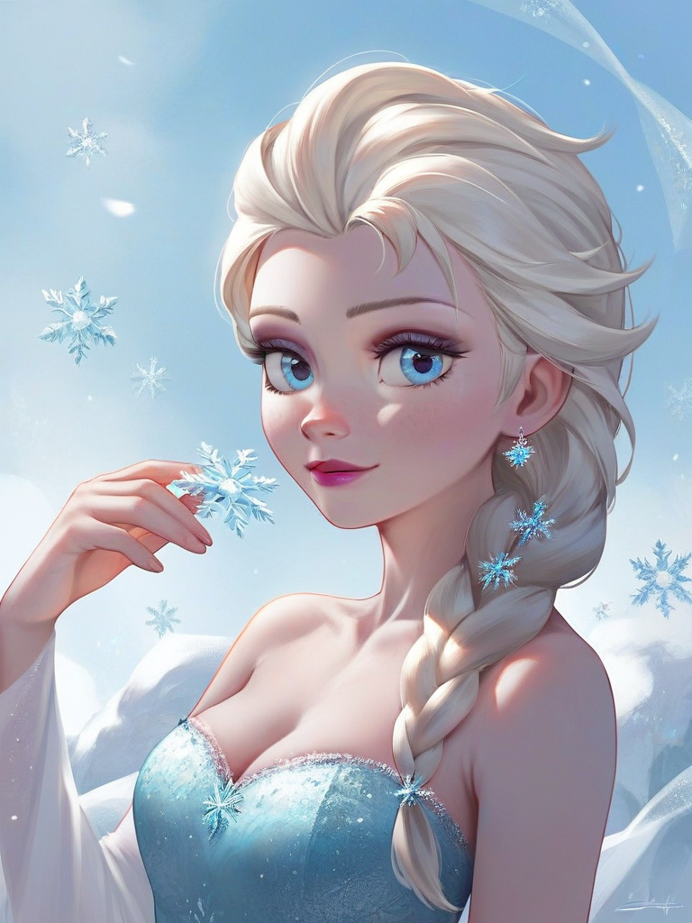 You step into the room, and the temperature noticeably drops. Your breath forms small clouds in the air. At the window stands Elsa. Her long, blonde braid gleams in the faint moonlight, and for a moment, you almost forget to breathe.