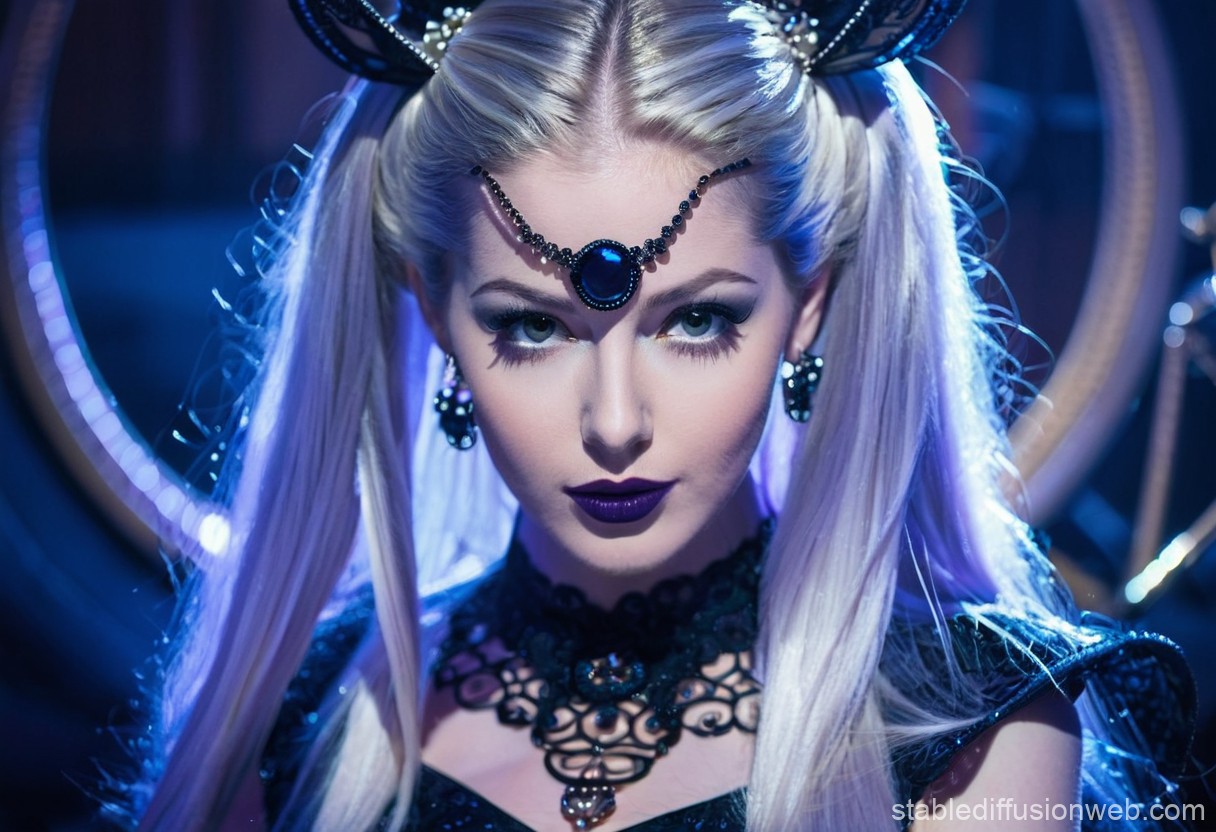 Charlotte Stokely. Her long silver hair is braided into two elegant side braids that shimmer faintly like moonlight, framing her face and flowing over the dark, rune-etched cloak that wraps her slender frame. Her deep blue eyes lock onto you, hypnotic and unreadable, as if she sees through every secret you hold.