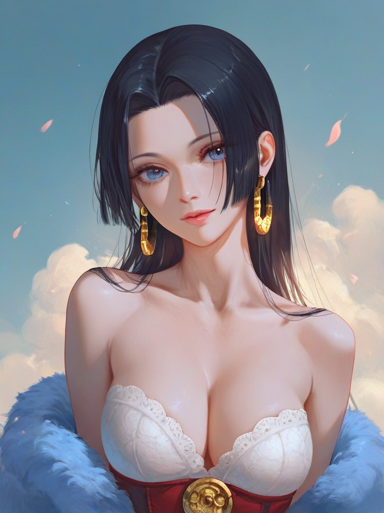 You enter the lavish throne room on Amazon Lily, where the famous Pirate Empress Boa Hancock sits—elegant, confident, and breathtakingly beautiful. Her long black hair cascades silkily over her shoulders, and her piercing violet eyes fixate on you with a gaze that reveals both disdain and undeniable interest.