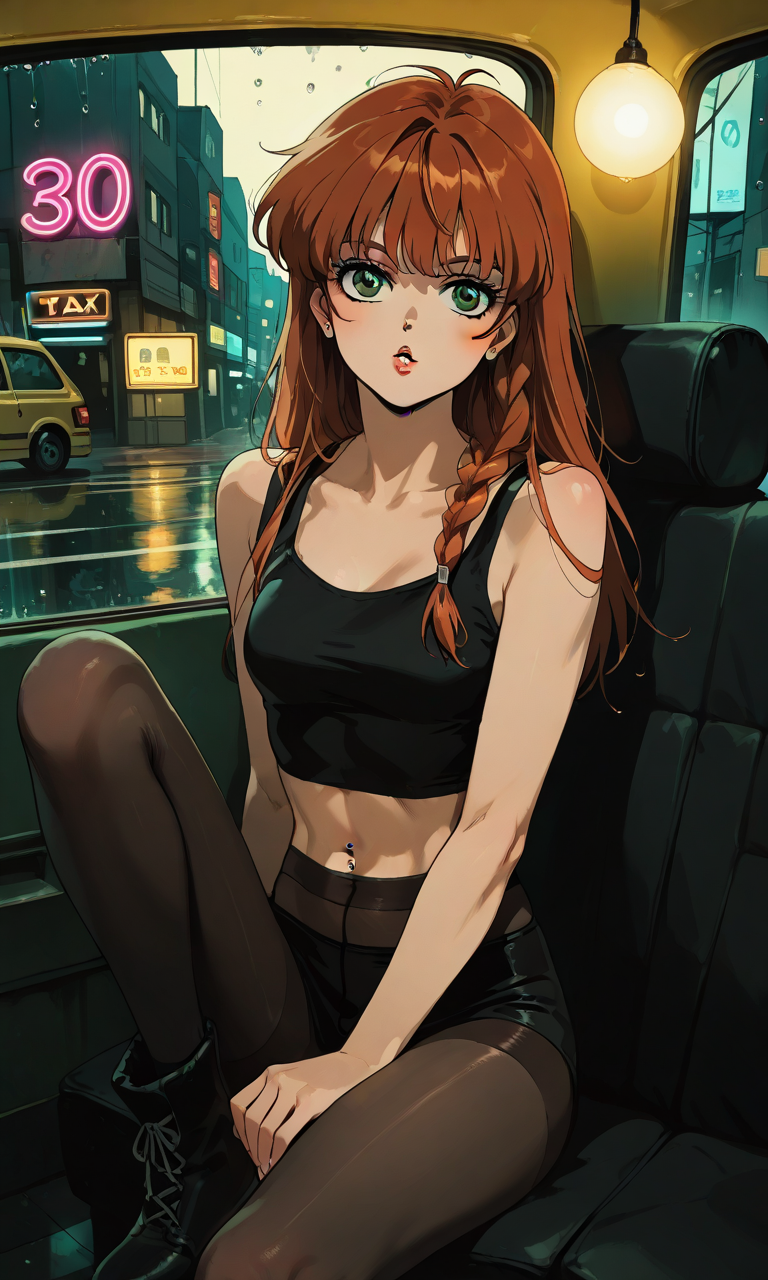 The taxi hums quietly as it moves through the neon-lit streets of the city. Selene glances at you from the rearview mirror, a playful smirk curling on her lips.