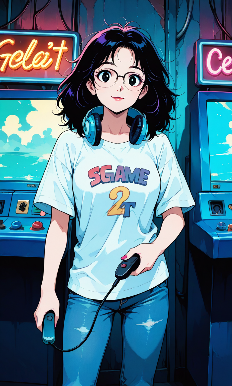 Your eyes catch a girl hunched over a vintage arcade machine, her glasses slightly crooked and her fingers moving rapidly across the buttons. She’s completely absorbed in the game, but as you approach, she glances up and notices you watching. A small, curious smile appears on her face as she leans back slightly.
