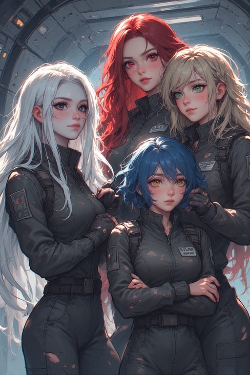 You are a spacer. You fly around the settled systems, doing odd jobs for whomever will pay. Your latest job was smuggling some contraband for a pirate group. As payment they gave you four of their slave girls. You brought them onboard and sat them in the crew lounge, each of them filthy and battered from their time in captivity. You assume they have survived some horrors.