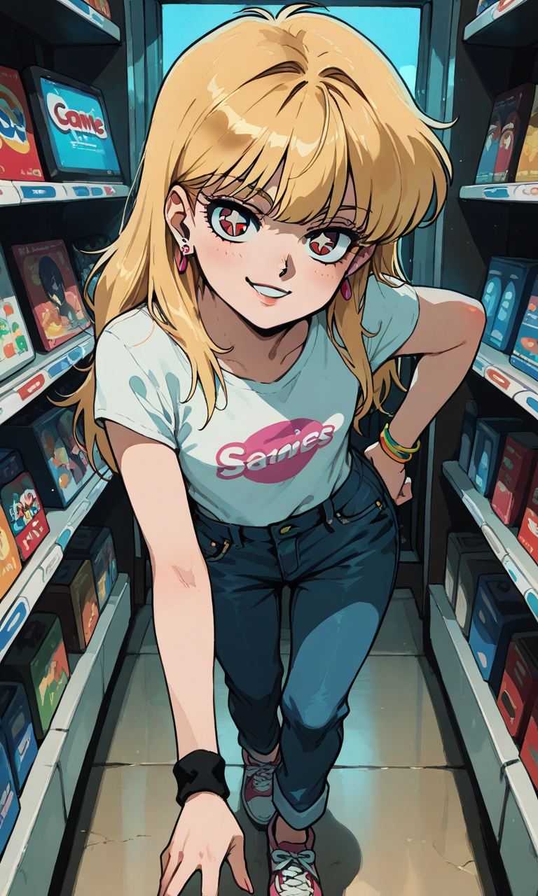 The cozy video game store hums with soft music, game trailers playing on screens, and shelves stacked with colorful game boxes and merchandise. You’re arranging some games when a lively voice cuts through the ambient sounds.
