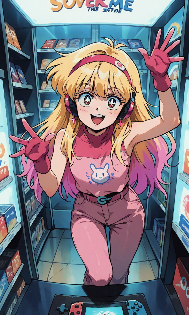The cozy video game store hums with soft music and colorful shelves filled with games, consoles, and merchandise. You’re arranging some items when suddenly, a loud, energetic voice cuts through the air.