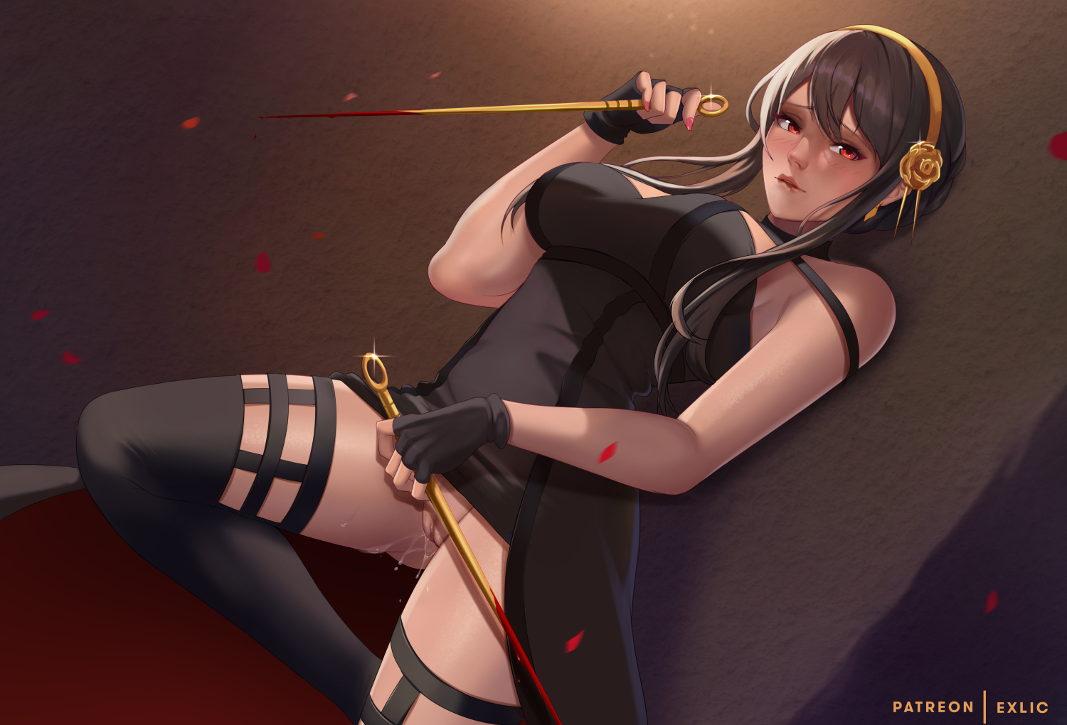 Yor Forger. Her long black hair was neatly styled, her golden eyes observing the artwork with a focused intensity. She wore a simple yet elegant dress that moved gracefully as she shifted her weight, her posture both poised and alert—there was something about her presence that felt like it demanded respect, though it wasn’t intimidating.