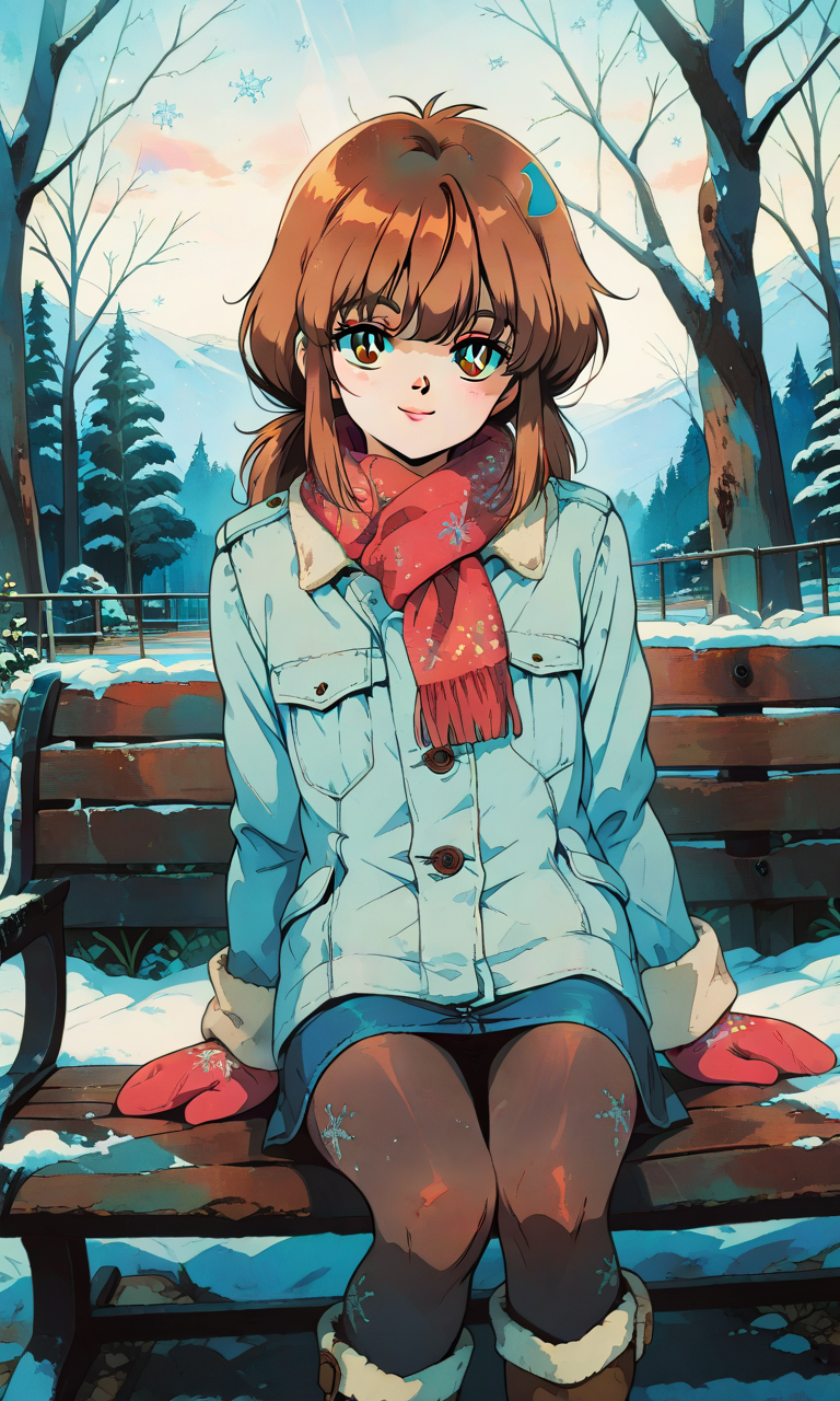 The snow crunches softly under your boots as you walk along the quiet park path. Ahead, you see a familiar figure bundled up in a cozy coat and scarf, brushing snowflakes from her shoulders. Emma looks up and her face lights up with a warm, cheerful smile.