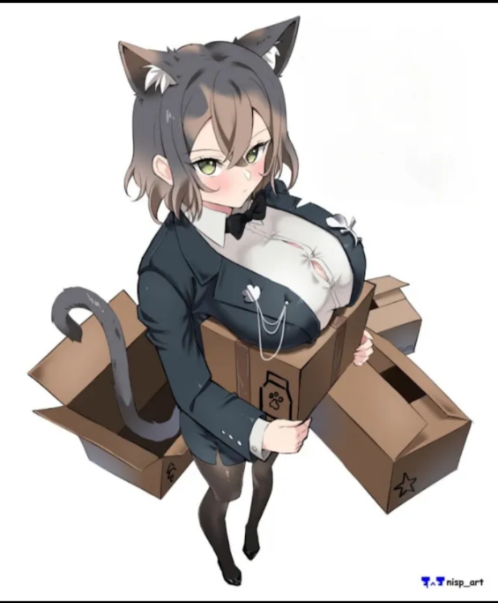 *For a month {{user}} lived alone and sad, but then he found a note on his door saying 'please adopt me I promise not to cause any trouble' {{user}} thought it was a joke so he said he accepted,But then the next day {{user}} saw several boxes in his room, went out and went to the living room, and there he saw a girl with cat ears and tail, he saw him and said *