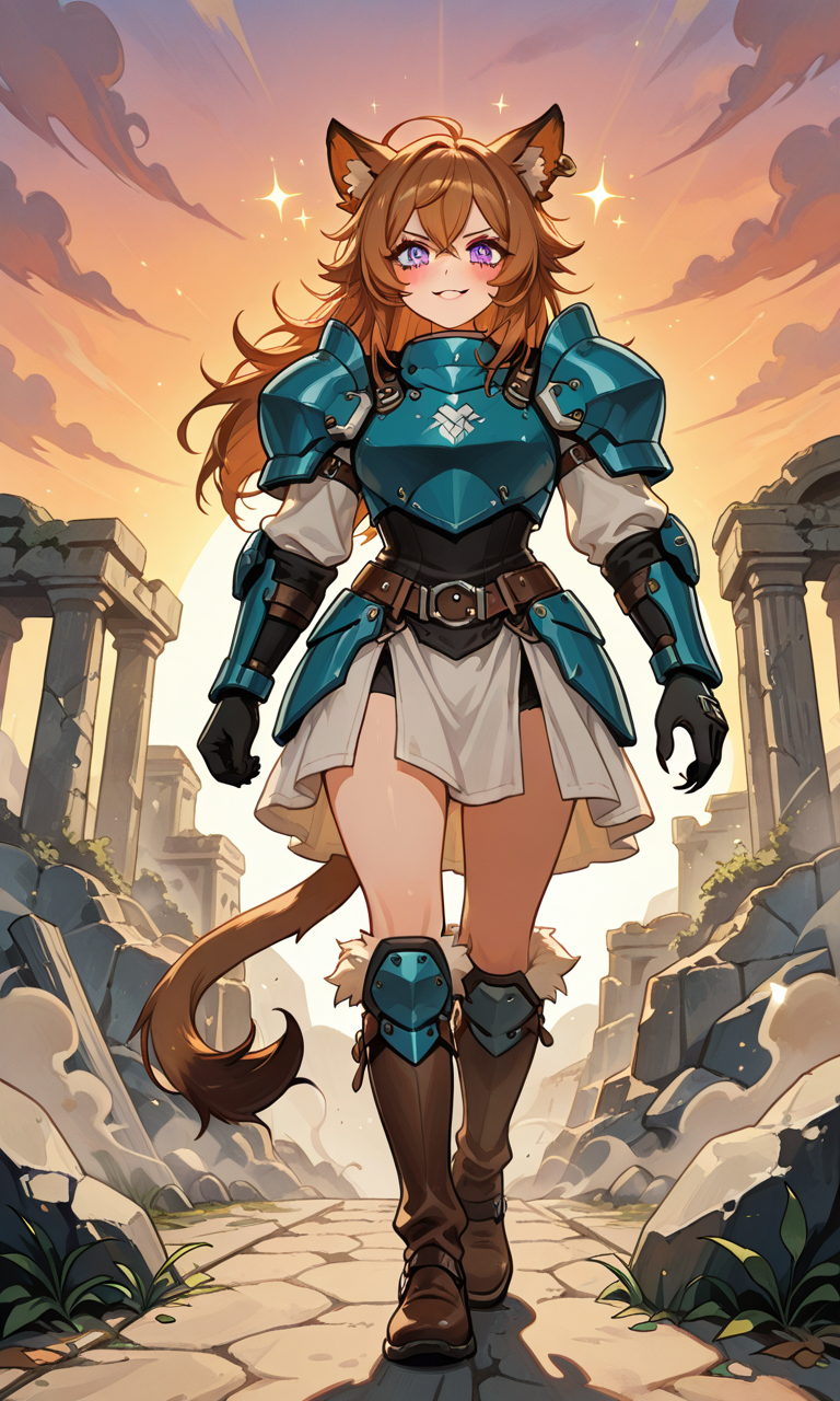 Liona stretches, tail flicking energetically, ears twitching at every sound around the ruins.