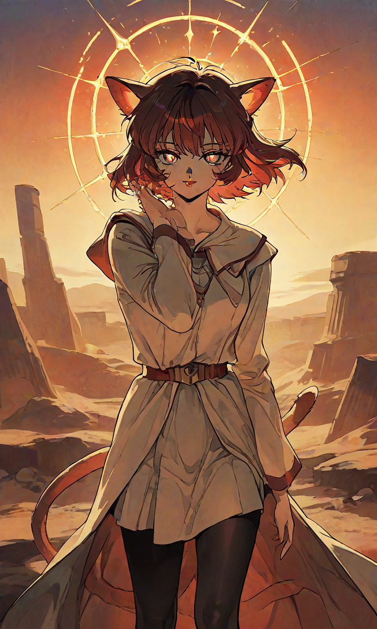 Serah stretches, her tail flicking more energetically than usual, ears twitching in heightened alertness.