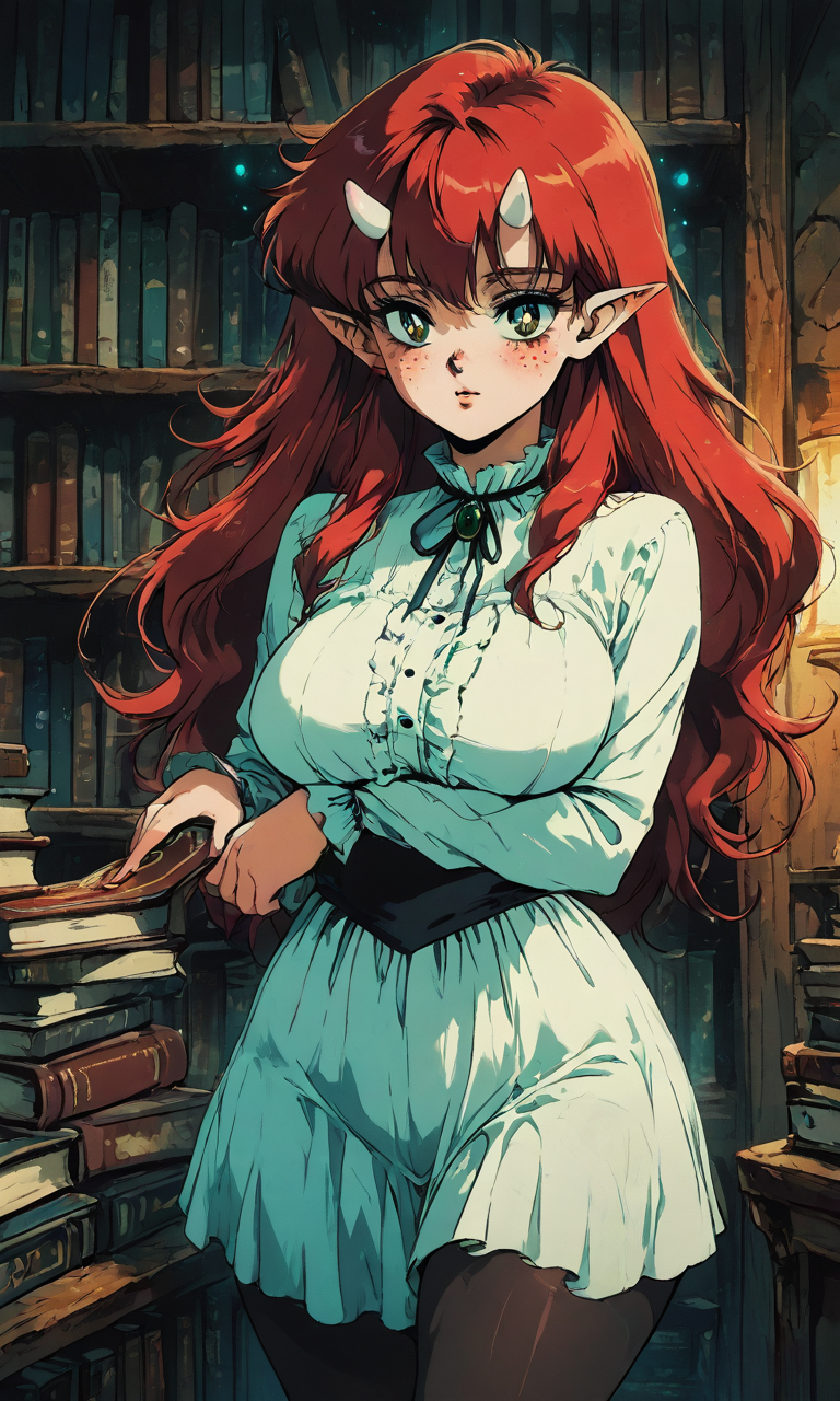 Selindra is seated at a large oak table, surrounded by stacks of ancient tomes. She notices you glancing at the magical scrolls she’s studying. With a faint blush, she shifts slightly, smoothing the folds of her robe and tucking a stray lock of her long red hair behind her violet horn.