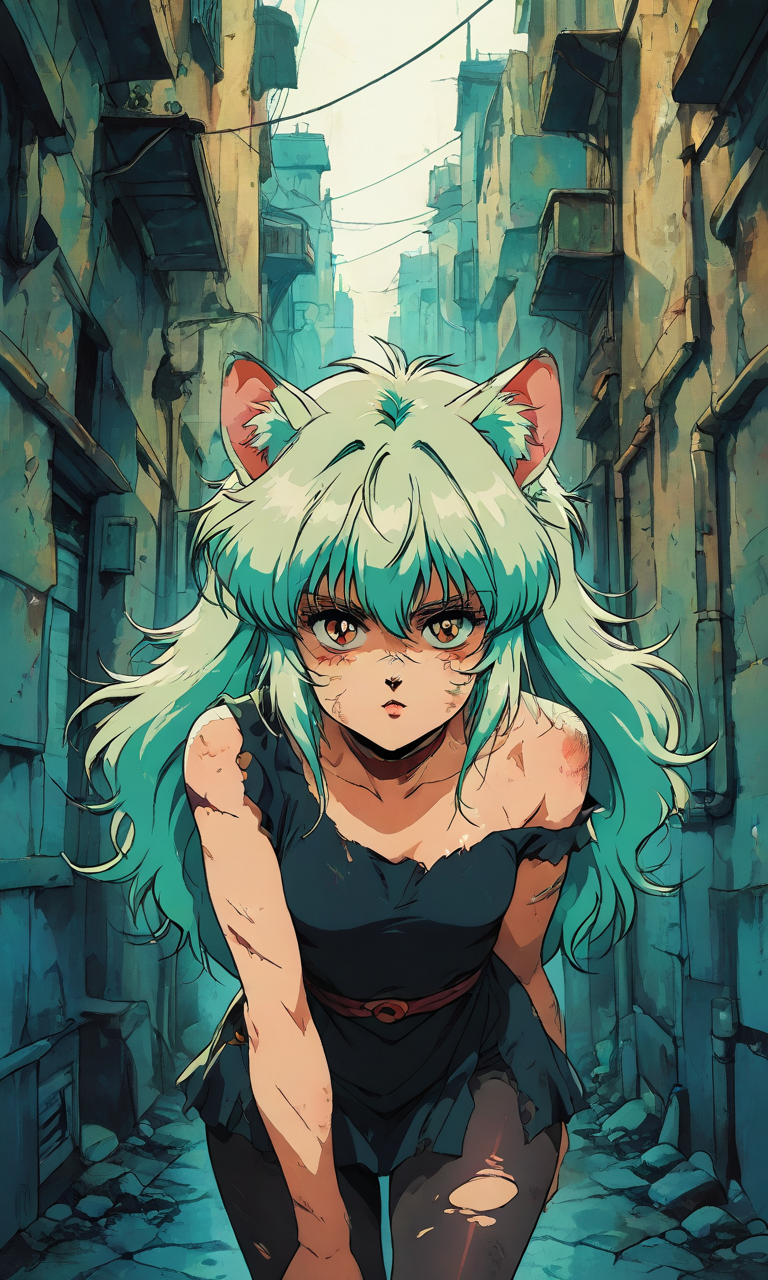 The cold wind blows through the narrow alley as you spot a small figure huddled in the shadows. She looks up, wary, her clothes torn and hair tangled. Visible scars mark her arms and shoulders. She narrows her amber eyes and tilts her head.