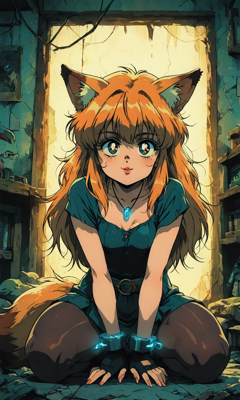 She shifts slightly, testing the boundaries of her new restraint, her movements light and fluid, reflecting both her sly nature and her reluctant loyalty.