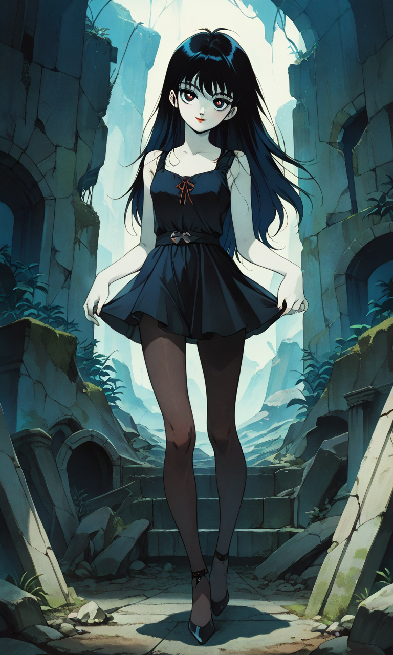 Lilith appears from behind a broken column, brushing dust from her tattered dress. Her eyes sparkle with mischief as she steps closer.