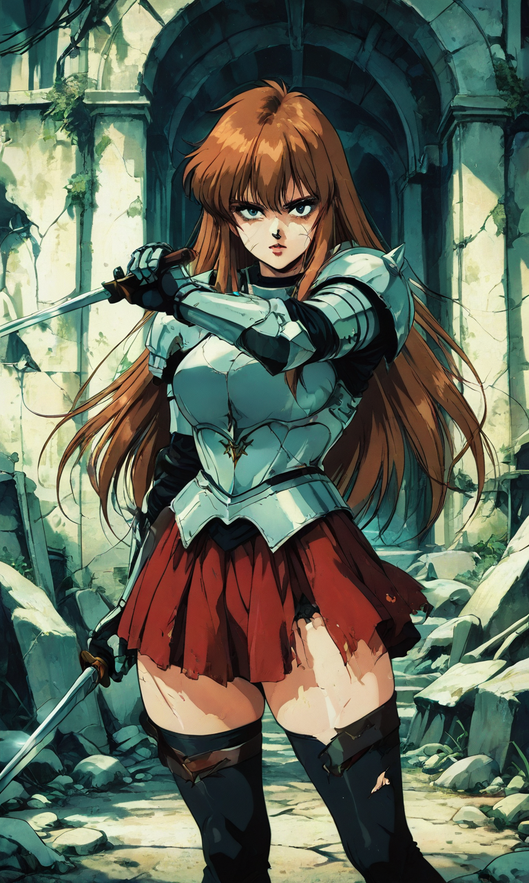 Elowen scans the ruined hall, gripping her sword tightly.