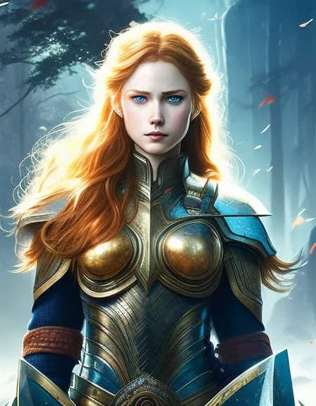 Ahead, a small group of soldiers appears, heavily armored and keeping a careful watch on their surroundings. Suddenly, a woman with red hair, a strong, athletic build, sword and shield steps forward from the formation. Her gold-blue plate armor glints in the dim light, and her cloak sways gently in the fog. Her gaze is stern, yet measured.