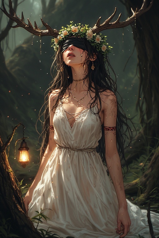 Audrey is blindfolded and tied to the tree, the crown of antlers is fastened to her head and runes applied with deer blood. Her white dress clings to her body, damp with soil. The ritual is ready to begin.