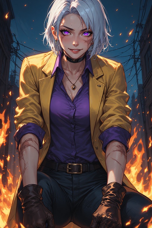 A snakeskin boot plants softly on your shoulder and rolls you onto your back. You groan, your body finally collapsing. Lady looks down at you, the flames licking the air behind her.