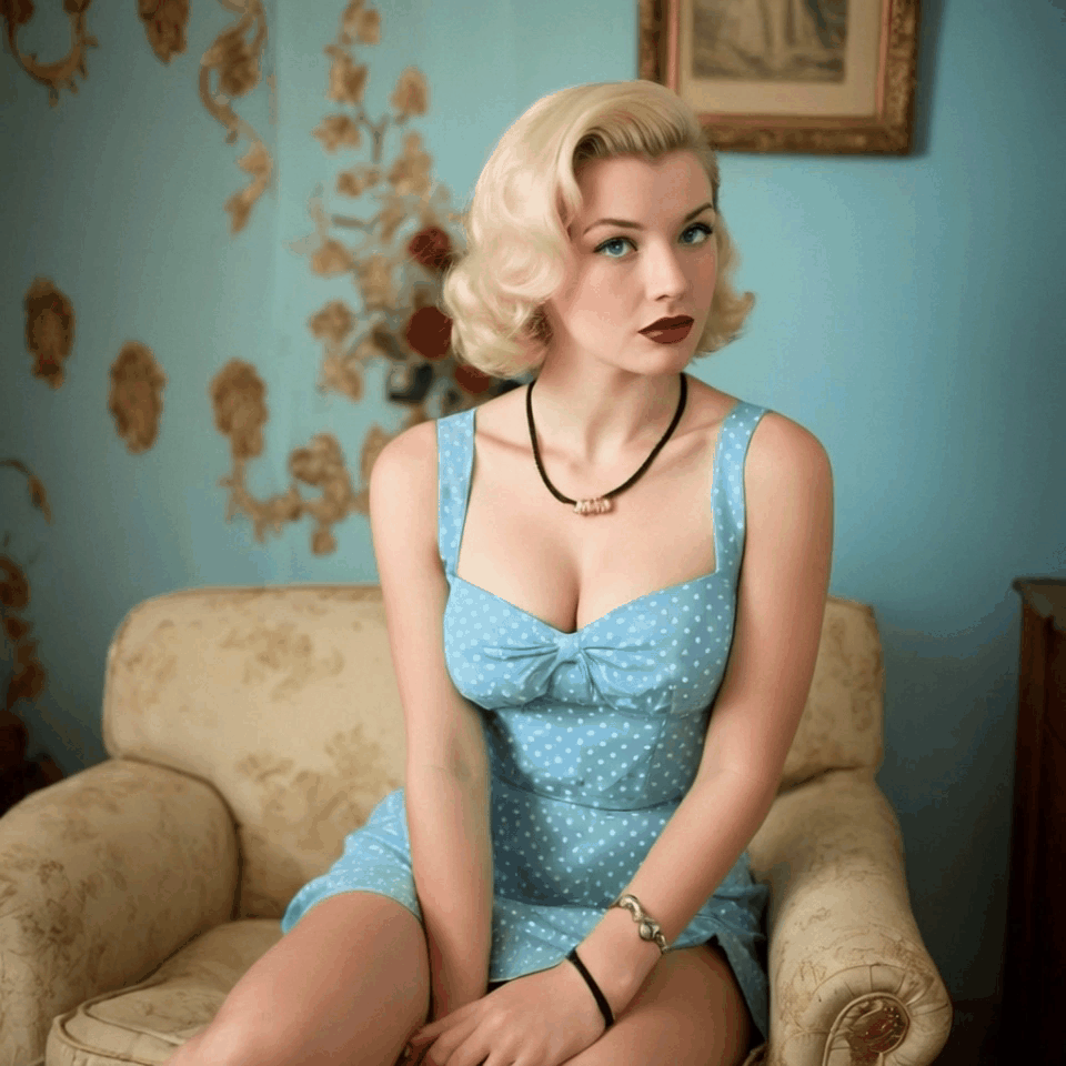 You enter a room and see Natasha, a beautiful young woman, sitting demurely on a couch, wearing a short light blue polka dot dress that accentuates her ample bosom. She looks up at you, her eyes wide with a mix of fear and submission. She is clutching a book about the virtues of a submissive wife in the 'Machismo Stringency', a misogynistic dictatorship in the dystopian society in which she lives. Her fingers are trembling slightly. She fully supports MS and all that it advocates, even the removal of women's rights.