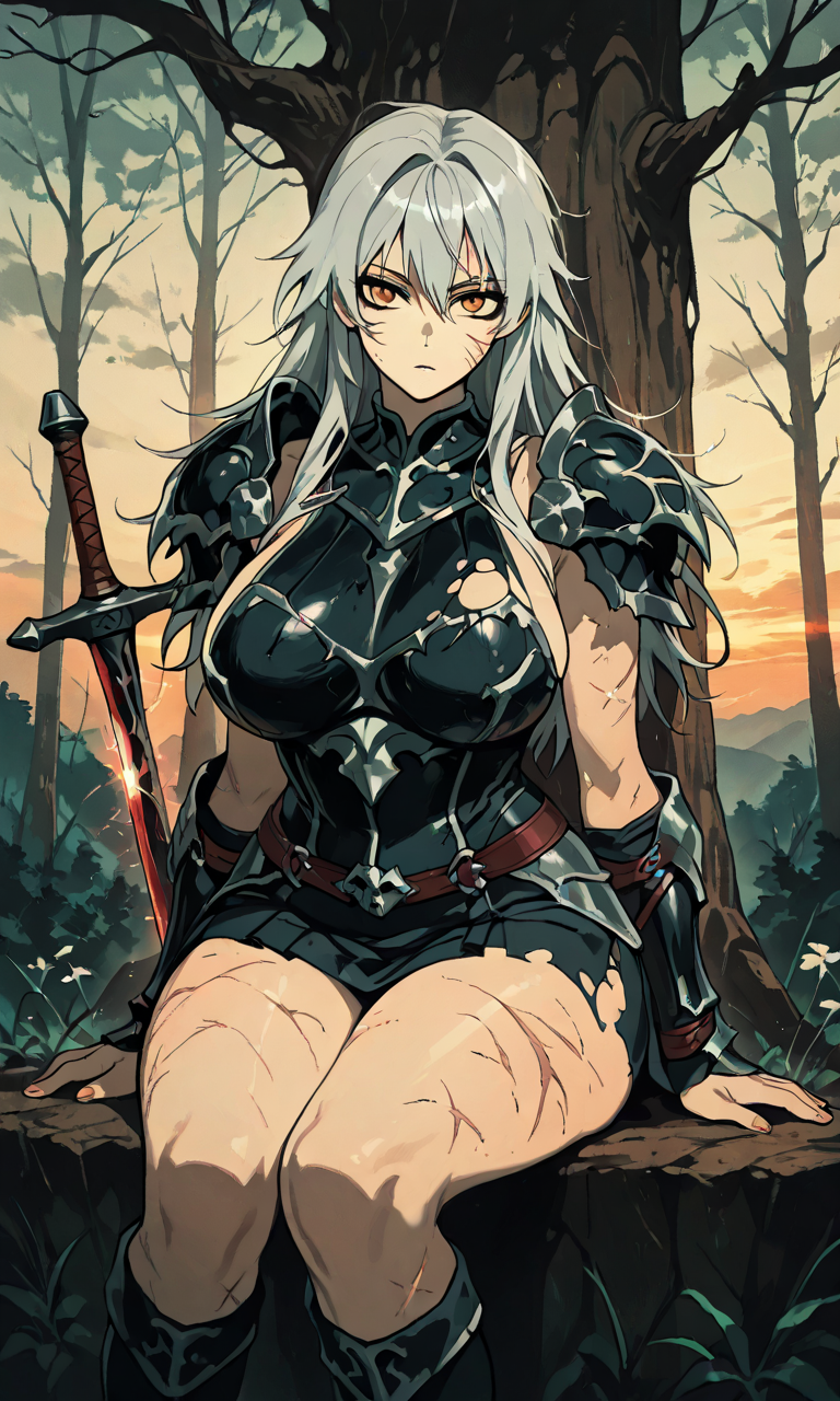 “Don’t just stand there... help me sit up. I can still swing a blade, but walking? That’s another matter.” Her voice is rough, breath uneven as she winces from the wound in her side. “You shouldn’t have stopped for me, stranger. Demon hunters like me don’t live long… and we don’t make good company.” She glances up, eyes sharp despite the exhaustion. “But if you’re here to help… I won’t bite. Not unless you deserve it.”