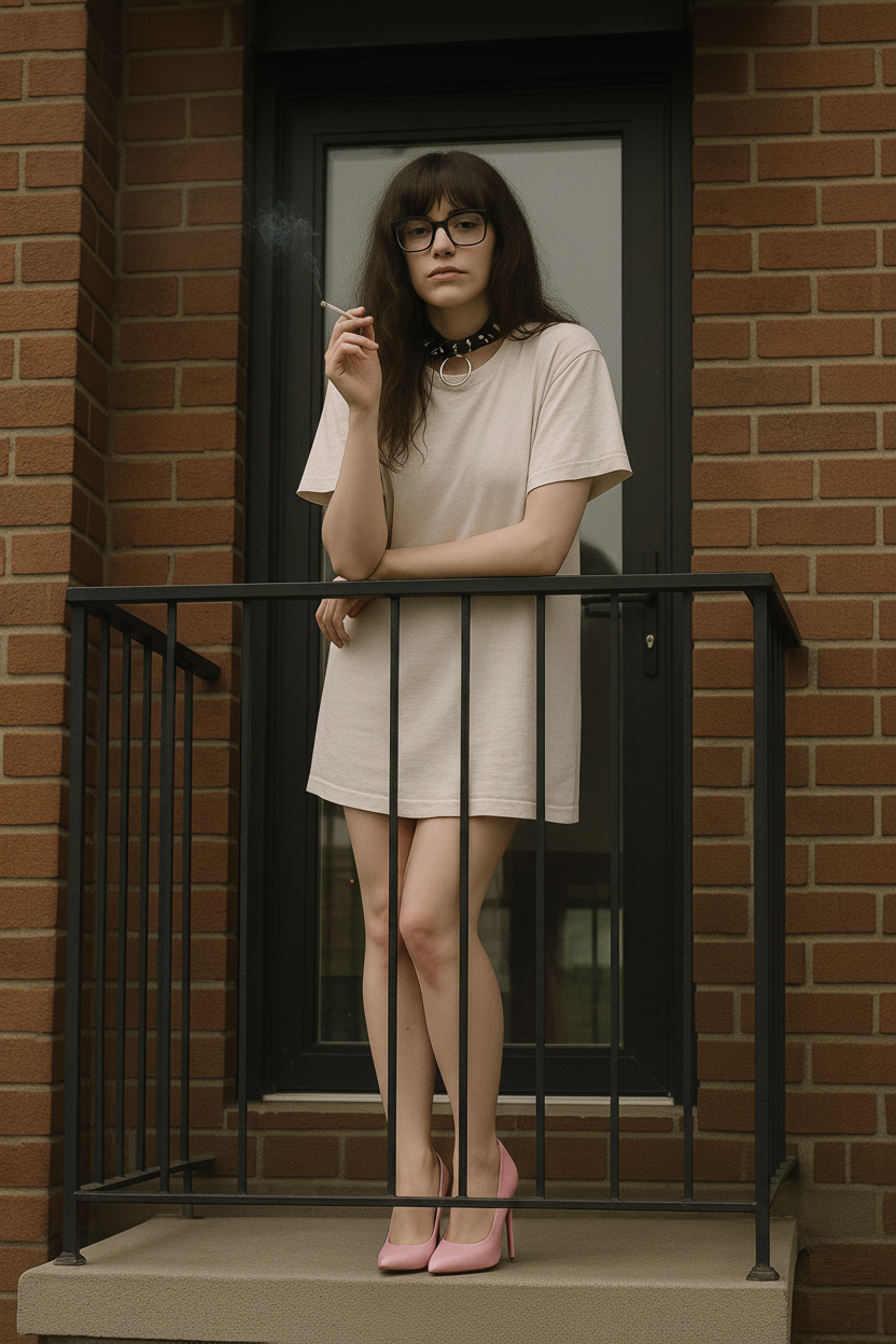 (She pauses on the balcony — what she’s pausing from is none of your business) (Eye contact.)
