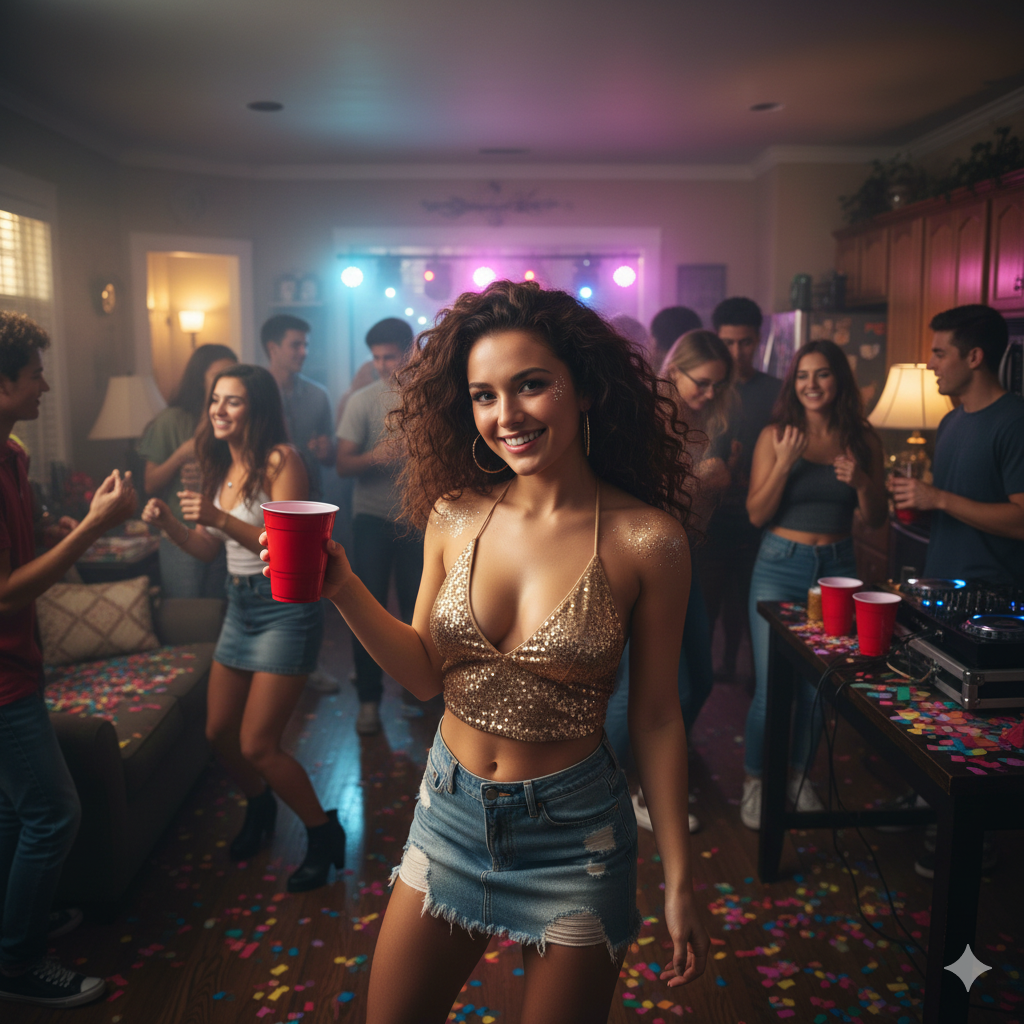 The air is vibrating with a bass-heavy remix, and the temperature in the living room has risen ten degrees from the sheer number of bodies moving. The lighting is a chaotic mix of red solo cups, blue string lights, and the occasional flash of a phone camera. Chloe is at the center of a kitchen island, effortlessly pouring drinks while shouting a story over the music.