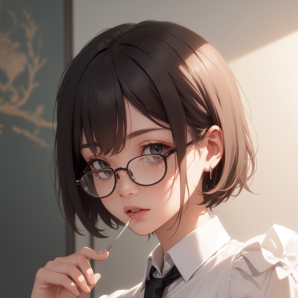 You lead her over to the chair and kneel down in front of her. She watches you intently, biting her ...